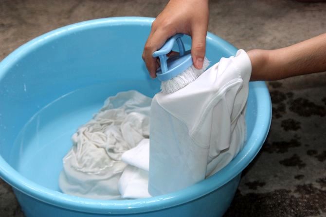 - لإزالة التلوث القديم ، من الأفضل أن تنقع الملابس في الماء لبضع ساعات. يمكن معالجتها بشكل إضافي بصابون الغسيل أو إضافة منظفات الغسيل.