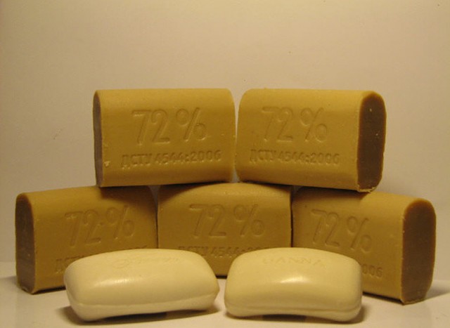 - خذ قطعة قماش متسخة ، بللها بحرية بالماء. باستخدام صابون الغسيل العادي ، افرك المنطقة الملوثة واتركه لمدة نصف ساعة تقريبًا حتى تنقع البقع. ثم حاول قفل الأوساخ وشطفها بالماء النظيف. إذا لزم الأمر ، كرر الإجراء مرة أخرى. الصابون مناسب لجميع أنواع الأقمشة ومعالجة ملابس الأطفال.