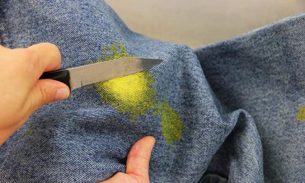 - إذا ظهرت طبقة سميكة من الغواش على سطح الملابس ، فينبغي إلغاء الطلاء المجفف بعناية بسكين ، ثم يجب تغطية المنطقة المصابة بصابون الغسيل وتركها في محلول الصابون لبضع ساعات. يجب تطبيق جميع منتجات التنظيف الأخرى بفرشاة.