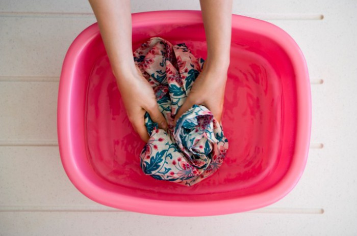 من الضروري غمر الملابس في ماء دافئ ، منفصل عن الأشياء الأخرى ، شطفها جيدًا ، ثم تجفيفها في الهواء النقي. هذا الإجراء ضروري للتخلص من الروائح النفاذة للنظافة. لا يمكنك استخدام العطر في هذه الحالة ، فهي لن تقضي على رائحة الأسيتون أو البنزين ، بل تخفيها لفترة وجيزة. للحفاظ على الأشياء طازجة ونظيفة ، من الأفضل التمسك بالشطف وتجفيفه على الشرفة لمدة يومين.