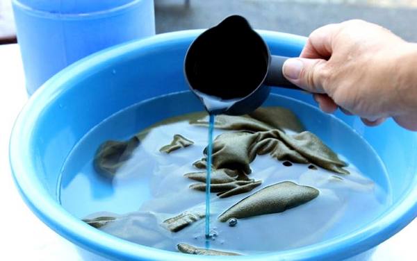 - التركيبية سيتم حرقه تحت المذيبات العدوانية ، لذلك من الأفضل استخدام الأمونيا مع الملح. أولاً ، يتم معالجة المنطقة الملوثة بالأمونيا ، ثم يتم نقع الشيء في الحوض الذي يحتوي بالفعل على ماء مالح.