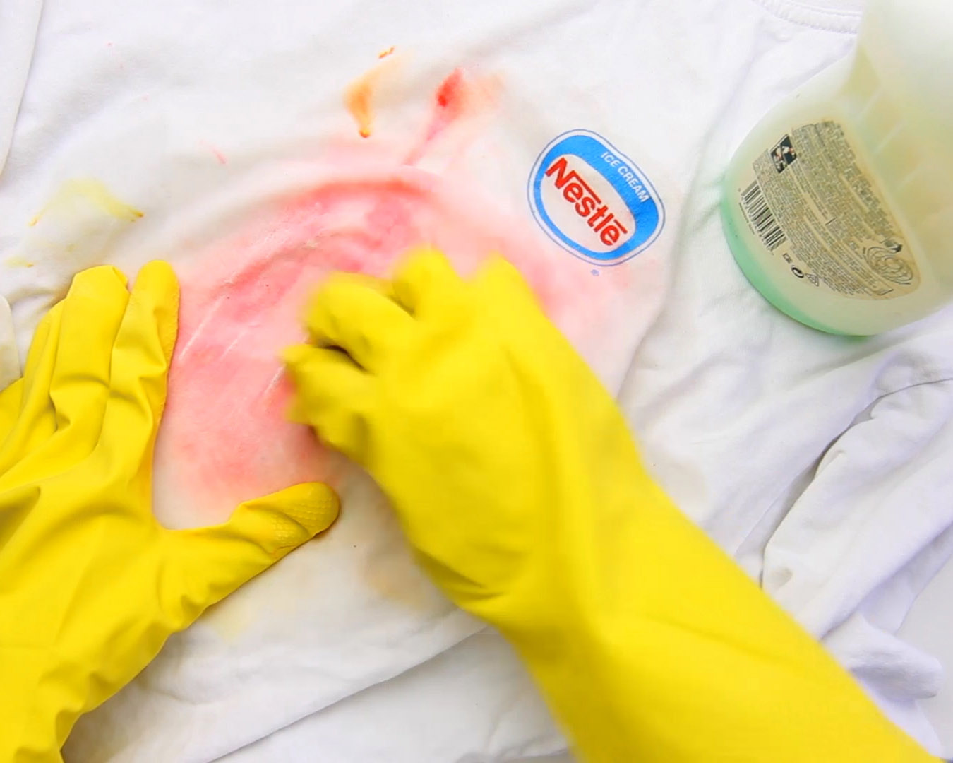 - سيكون من الأصعب بكثير القضاء على بقعة ملطخة ؛ لذلك ستحتاج إلى مدفعية ثقيلة في شكل مذيب خاص ومبيض (للنسيج ذي اللون الفاتح) ومزيل للبقع (للون).