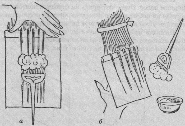 تقوم فرشاة بتوزيع كتلة الحبر على كامل طولها ، دون تجنيبها ، وإلا ستكون هناك جزر صغيرة غير مصبوغة. انشر خيوط ملونة على رقائق معدنية ، غطيها بغشاء ملتصق وحافظ على الكثير من الوقت الموصى به لهذا النوع من الطلاء. اشطف بالماء الدافئ ، واتركه على منشفة حتى تجف الخيط.