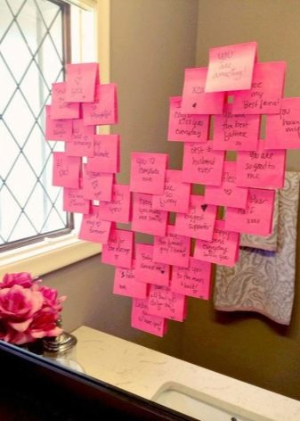 اشترِ الملصقات الورقية على شكل قلب ، إذا لم تكن موجودة في المتجر ، فقم بقطع الملصقات الأكثر شيوعًا. بينما لا يزال الزوج نائمًا ، اكتب على كل كلمة شكر ، يجب أن تكون عبارة عن عبارات صغيرة ، يبدأ كل منها بالعبارة "شكرا لك على حقيقة أن ...".