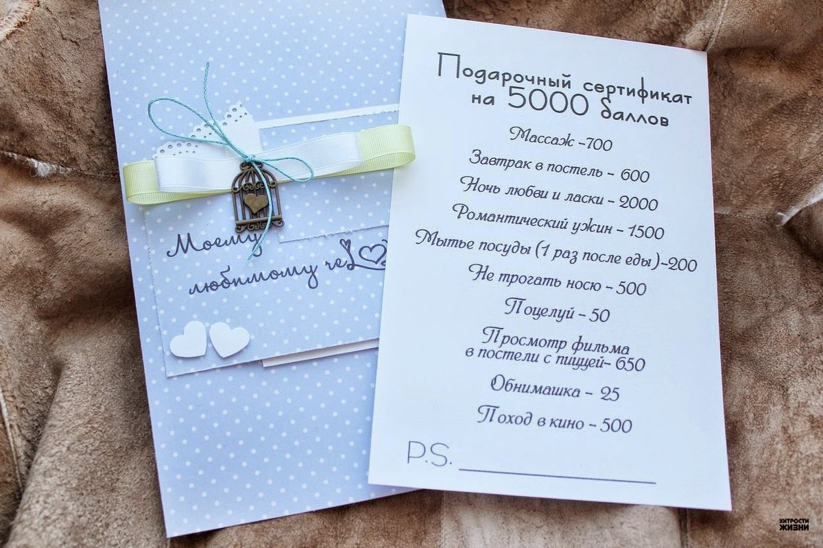 - شهادات الهدية. لا يتعلق الأمر بالشهادات التي يتم تبادلها مقابل نوع من الخدمة الخارجية. نحن نتحدث عن شهادات عصامي. خذ ورقة A4 عادية واطبع عليها شهادة الهدية هذه ، على سبيل المثال ، مقابل 1000 نقطة. بعد ذلك ، اكتب "الخدمات". يمكن أن يكون أي. على سبيل المثال ، "تدليك" - 200 نقطة وما إلى ذلك. باختصار ، يجب أن تتجاوز جميع "الخدمات" أكثر من 1000 نقطة ، بحيث يمكن للشخص اختيار أكثر الخيارات لذيذًا.