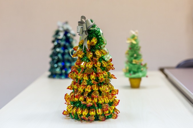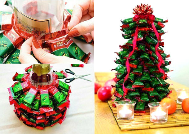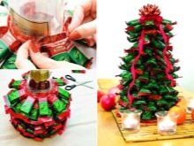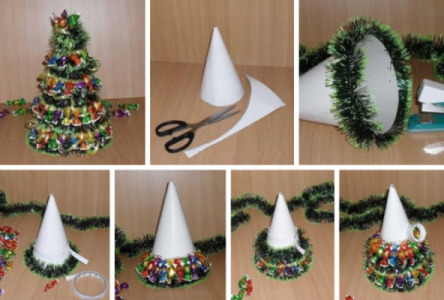 هدية حلوة تحت عنوان سيكون شجرة عيد الميلاد من الحلويات. لتصنع ذلك ، ستحتاج إلى حلويات معبأة في غلاف ، بالإضافة إلى ورقة من الورق المقوى سيتم تشكيل إطار شجرة السنة الجديدة منها. المخروط مصنوع من الورق ، الذي يجب أن يكون ثابتًا جيدًا في القاعدة ، ثم بمساعدة شريط سكوتش أو غراء أو مواد أخرى ، توضع الحلوى في دائرة من شجرة التنوب المستقبلية.