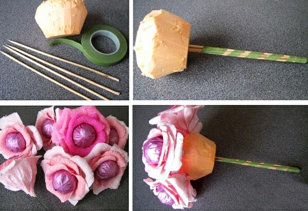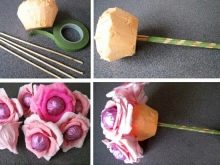 من السهل جدًا صنع برعم ؛ للقيام بذلك ، حلاوة الرياح على أحد أطراف سيخ ، وبعد ذلك ، باستخدام الورق الملون ، قم بوضع حد للحلوى على شكل بتلات الزهور. يتم جمع العديد من هذه البراعم في باقة واحدة ، والتي ينبغي أن تكون مزينة بالإضافة إلى البضائع السنة الجديدة. كإضافة احتفالية ، يمكنك استخدام فروع أو مخروطات صنوبرية صغيرة. سوف تحتاج الهدية أيضًا إلى وضعها في حزمة شفافة.