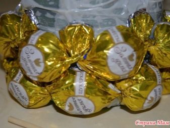 بالنسبة لأولئك الذين يحتاجون إلى إعداد الكثير من الهدايا ، يوصى باستخدام فكرة أكثر اقتصادا مع الحلويات. يمكنك تزيين حانة شوكولاتة عادية بألوان حلوى أو ثلاثة ألوان جميلة. لهذه الأغراض ، يتم أخذ الشوكولاتة كأساس ؛ يمكن أيضًا لفها بلفائف رأس السنة الجديدة. بعد ذلك ، تصنع البراعم الحلوة من حلويات ، ترتبط مع القاعدة بهرج أو غصن من التنوب.