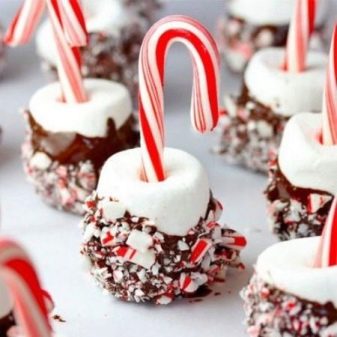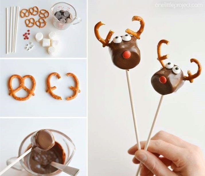 يمكن صنع العديد من الحلويات ذات السمات من الخطمي والمعجنات. يجب أن توضع حساسية مهواة على أسياخ أو العصي الكرمل. من المعجنات المقسمة إلى جزأين ، اصنع قرون الغزلان على الخطمي ، تذوب الشوكولاتة وتراجع هناك. ويمكن إجراء العينين والأنف مسحوق الحلويات.