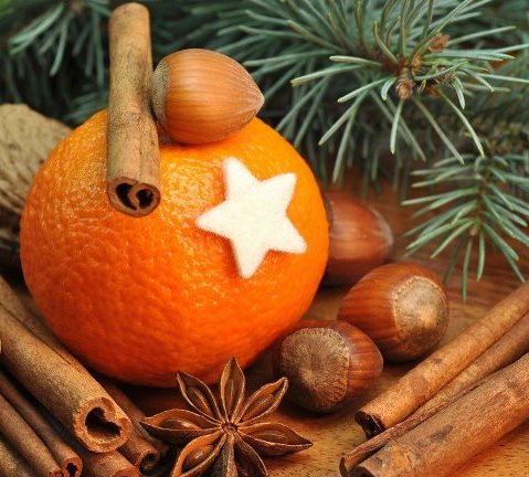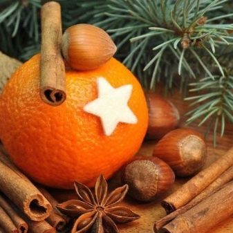 يجب أن تزين كل فاكهة بعصي القرفة ، لذلك ، فهي ببساطة عالقة في اليوسفي في دائرة. بعد ذلك ، يتم وضعها على مسواك منتظم ، وبعد ذلك يتم تثبيتها على القاعدة بحافة حرة.