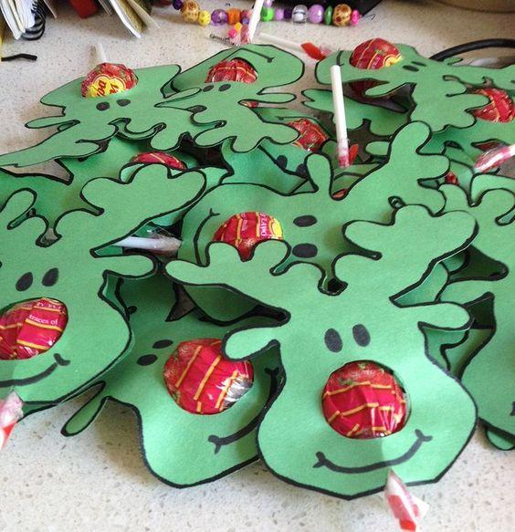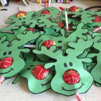 بالنسبة للأطفال ، يمكن صنع هدية جميلة من مصاصات عادية. يمكن قطع الحلوى المزينة بشكل جميل بروح السنة الجديدة عن وجه الغزلان أو رجل الثلج أو سانتا كلوز أو أي شخصية أخرى من الورق أو الورق المقوى أو القماش السميك.