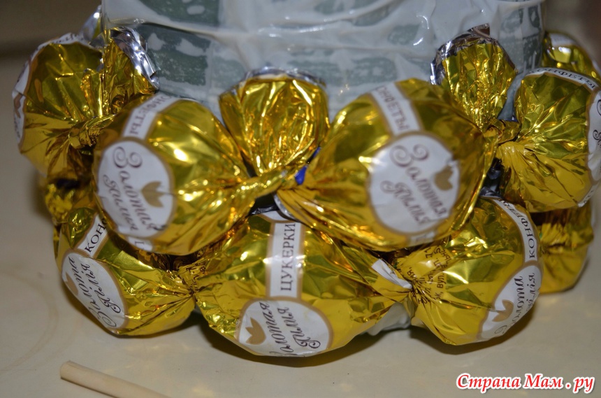 علاوة على ذلك ، يتم لصق جميع العناصر بورق ملون ، وبعد ذلك يتم وضع الحلوى على الشريط على الوجهين وفقًا لأشكالها وأحجامها.