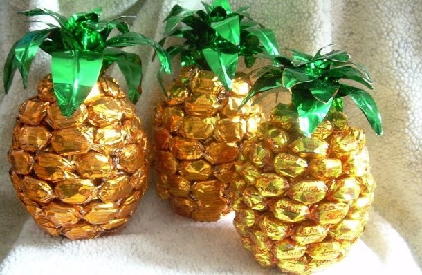 سوف الحلوى جعل الأناناس. سيتم استخدام وعاء زجاجي كقاعدة ، والتي يجب أن تملأ مع مختلف الحلوى الصغيرة الحجم. لإنشاء فاكهة غريبة ستحتاج أيضًا إلى حلوى مستديرة في غلاف ذهبي. يجب تثبيتها في أقرب وقت ممكن مع بعضها البعض بمساعدة من thermogun. كأعلى ، يمكنك استخدام ورق أخضر مموج أو مموج. يجب قطع المواد على شكل أوراق وتعلقها على عنق الجرة.