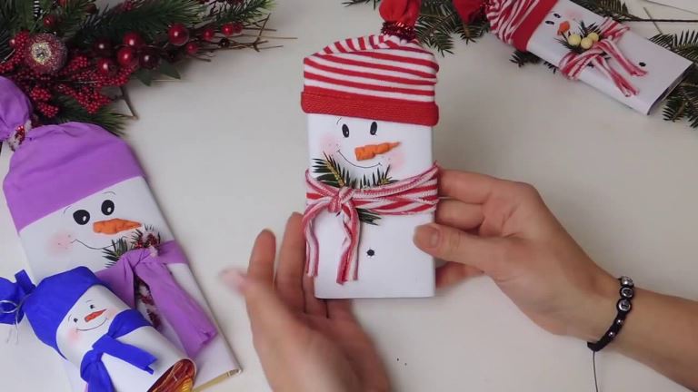 في شكل هدية لذيذة ، مزينة بيديه ، سيكون من الممكن استخدام قطع الشوكولاته. من أجل الحصول على مظهر مناسب للعطلات ، من الضروري لفه بورقة وإخفاء وإلصاق الحواف والمفاصل. بعد ذلك ، يتم رسم ثلج على أحد الجانبين ؛ كديكور ، يمكن قطع الأنف من شعره ، ويمكن أن تكون العينين مصنوعة من الخرز.