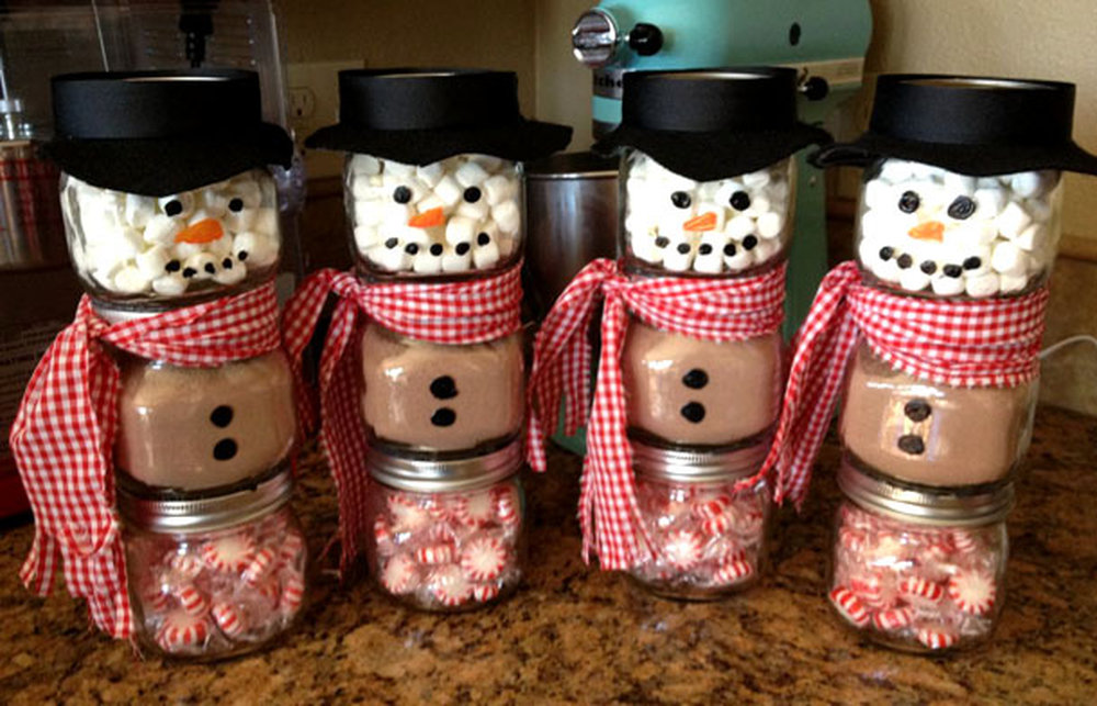 فكرة هدية أصلية مع استخدام الحلوى يمكن أن يكون خيار ثلج الزجاج. لإنشائها ، ستحتاج إلى عبوات صغيرة ذات غطاء ، وستكون العبوة المثالية من أغذية الأطفال. للجسم سوف تتطلب ثلاثة بنوك التي يتم لصقها معا. في كل منها ، يجب عليك أولاً وضع الحلوى الدائرية أو حلوى الكراميل أو البرتقال أو الشوكولاته. سيكون من الممكن طلاء الزجاج بمساعدة دهانات الأكريليك.