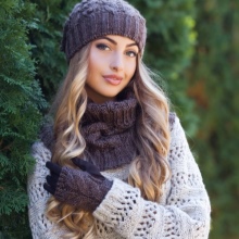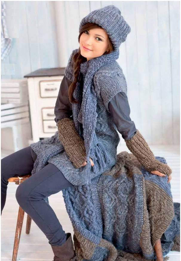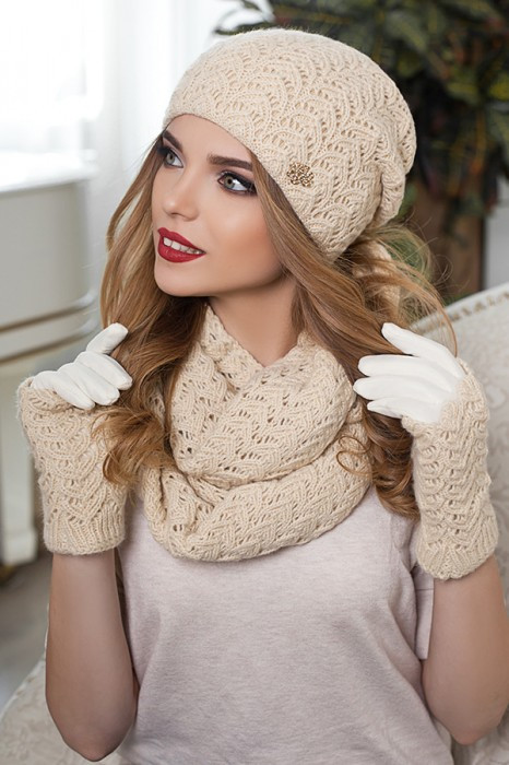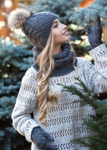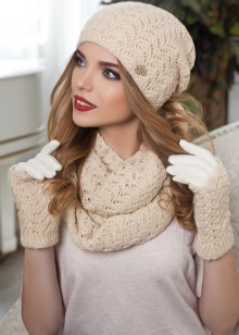 مجموعة أنثوية لطيفة المظهر بألوان حساسة ، تتكون من قبعة دائرية ووشاح طويل ، ستناسب معظم مصممي الأزياء. وتستكمل المجموعة من القفازات الدافئة. هذه المجموعة من الملحقات مثالية لطبيعة رومانسية. مع مثل هذا الحاشية سترة دافئة أو سترة أسفل ، يتم الجمع بين معطف قصير دافئ تماما. سوف ترتدي الزي لأولئك الذين يحبون الراحة والأنوثة ، دون تفاصيل لا لزوم لها.