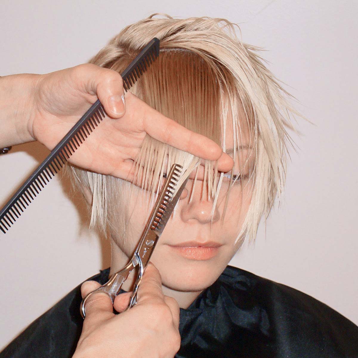 - الانزلاق هو طريقة يجب أن يتم بها الحفاظ على المقص بالتوازي مع الشعر. شروط التنفيذ المهمة هي الدقة ومعدل المعالجة البطيئة لكل حبلا.