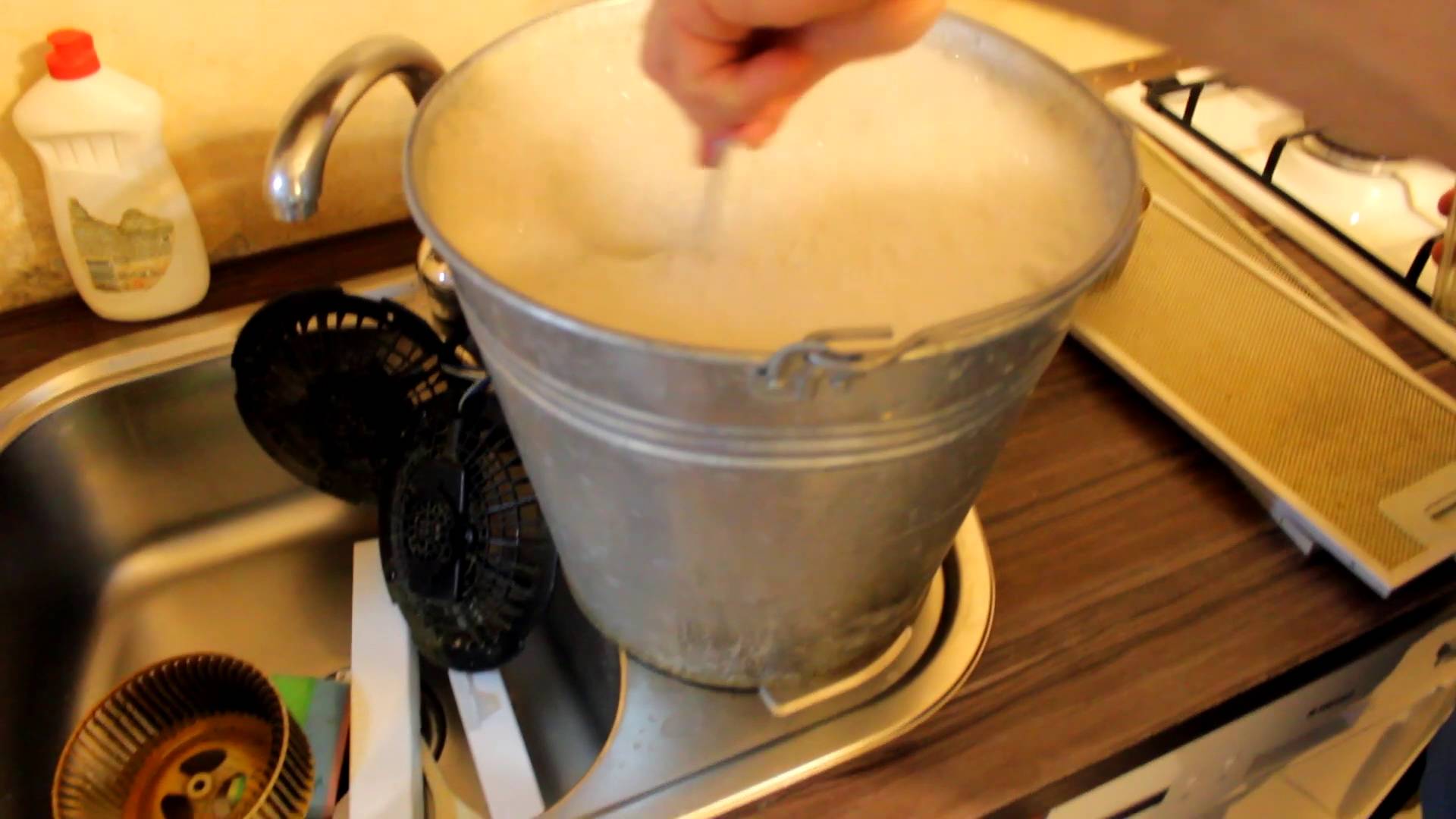 عندما تكتسب الدهون الموجودة على الغطاء لونًا بنيًا غنيًا ، فهذا يعني أنه تم تجميده بالفعل. في هذه الحالة ، يمكن أن تساعد طريقة أخرى مثبتة - الهضم. نفذ هذا على النحو التالي: في وعاء كبير مليء بالمياه الجارية ، ضع الأجزاء الملوثة من الغطاء. يجب أن تغطي المياه تماما التفاصيل. ثم يتم وضع هذه الحاوية على النار ، ويضاف نصف قطعة من صابون الغسيل (ويفضل أن يكون ذلك مع نسبة الأحماض الدهنية التي لا تقل عن 72 ٪) واثنين من ملاعق كبيرة من الصودا. يتم إحضار التركيبة الناتجة إلى درجة الغليان والاحتفاظ بها لمدة 30-40 دقيقة. إذا بدأ الماء في التبخر ، فيجب إعادة تعبئته حتى لا تظهر أجزاء العادم فوق السطح.