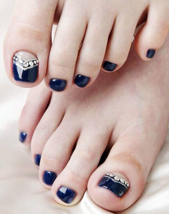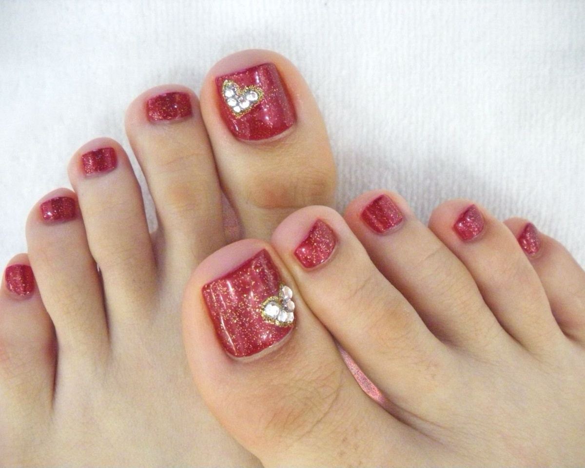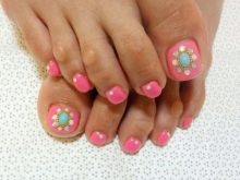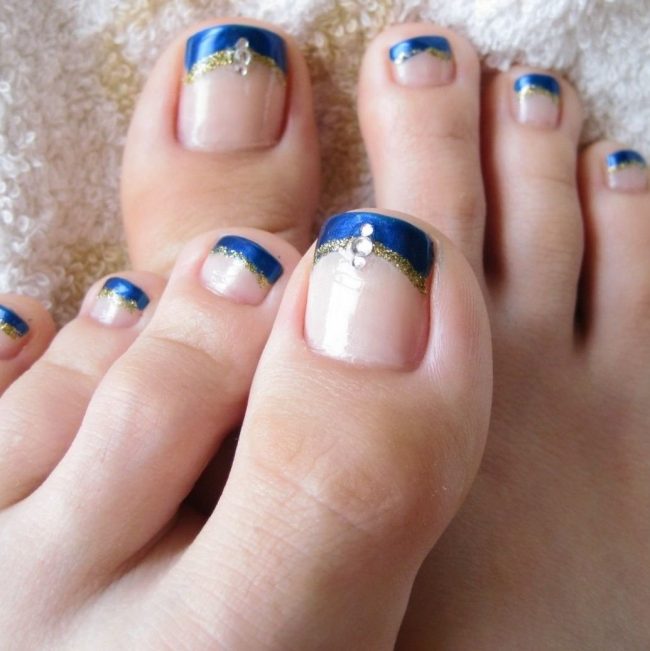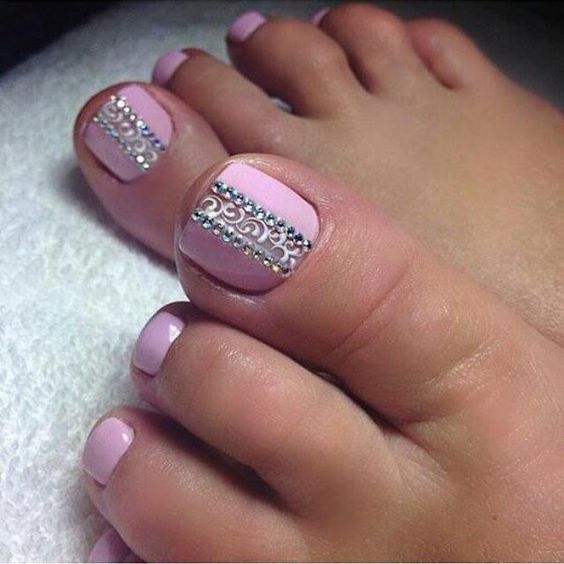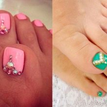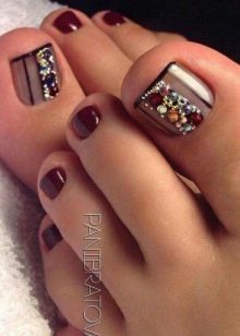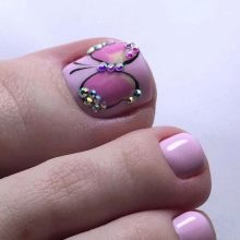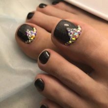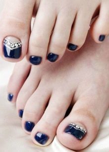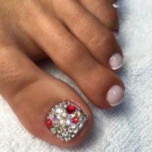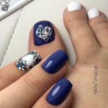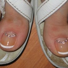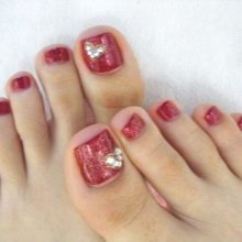 Il sera avantageux de regarder pédicure avec des motifs disposés avec de petits strass. Ainsi, vous pouvez coller un petit coeur sur le pouce avec des strass transparents. Il est permis d’utiliser des pierres de couleur, mais il est également préférable de prendre une seule couleur.