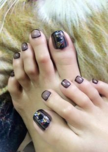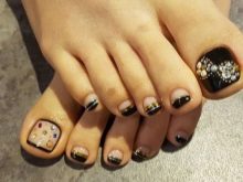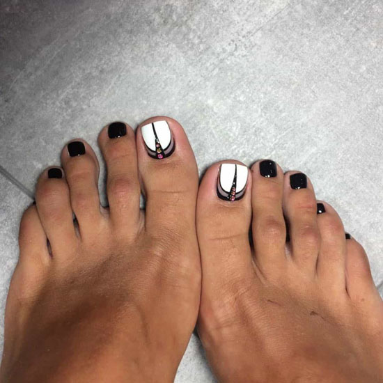 Au-dessus du clou sur le pouce, vous pouvez coller un seul strass brillant. Mais en même temps, il est préférable de prendre une décoration plutôt grande. Il est également possible de décorer une telle pédicure avec un mince ruban doré ou argenté.
