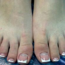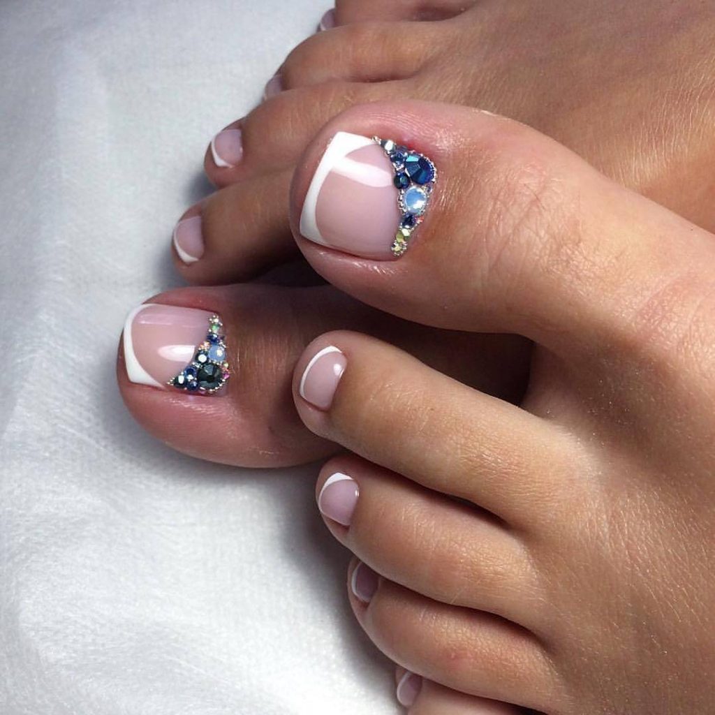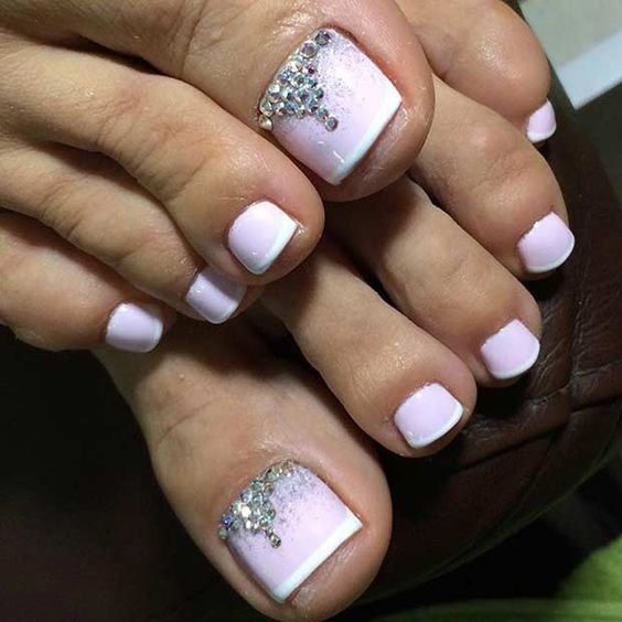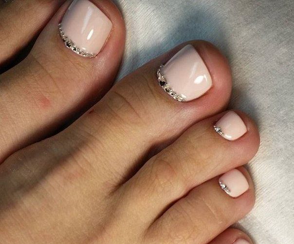L'option classique est une pédicure avec un revêtement de la partie supérieure de la plaque de couleur blanche ou laiteuse. La partie inférieure dans ce cas est faite d'une nuance rose pâle ou bleu pâle avec une bande composée de pierres. Il peut être collé en demi-cercle, de sorte que tout aura l'air beaucoup plus soigné et plus beau.