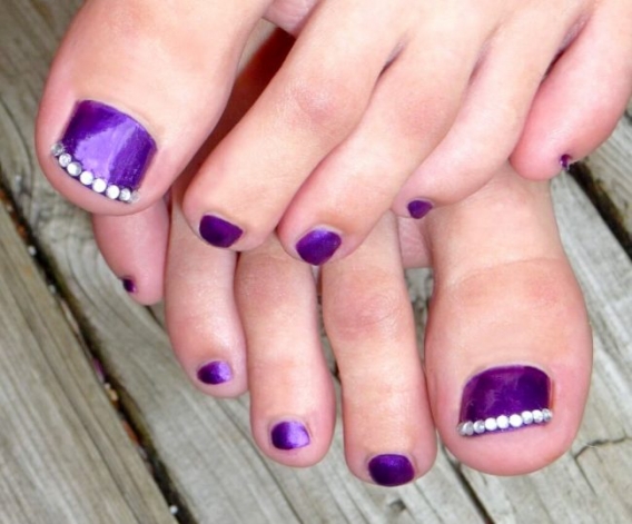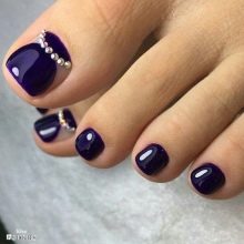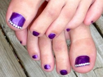 Aujourd'hui est considéré comme un pédicure à la mode, fabriqué dans une couleur, mais joliment décoré de strass. Vous pouvez donc couvrir vos ongles avec une couleur vive (violet, rouge, rose foncé, turquoise, bleu) et mettre une composition soignée de strass multicolores, grands et petits, sur la plaque de l'ongle de votre pouce afin qu'ils s'étendent sur toute la longueur.