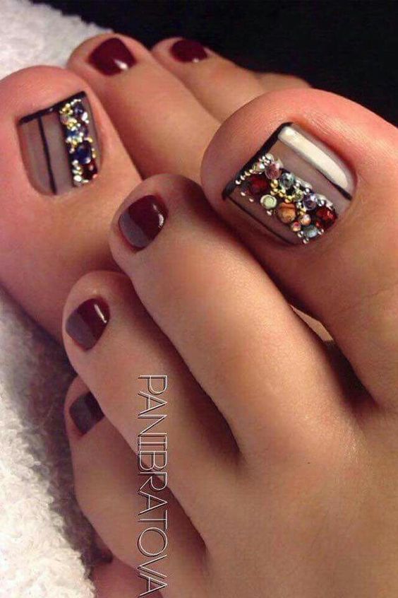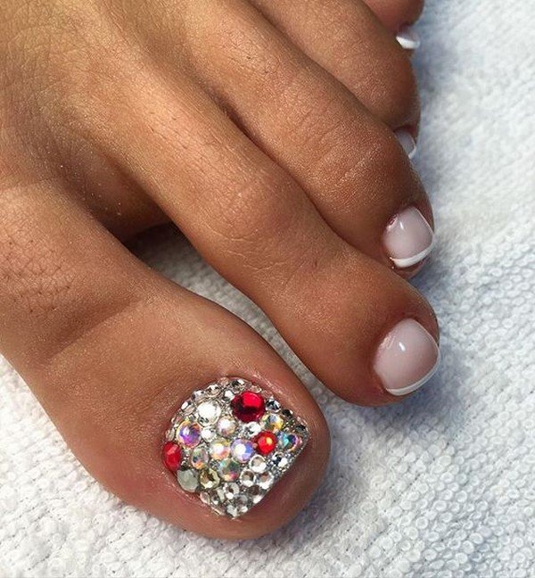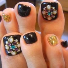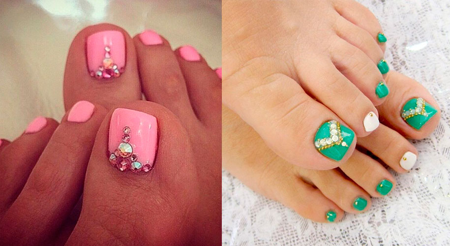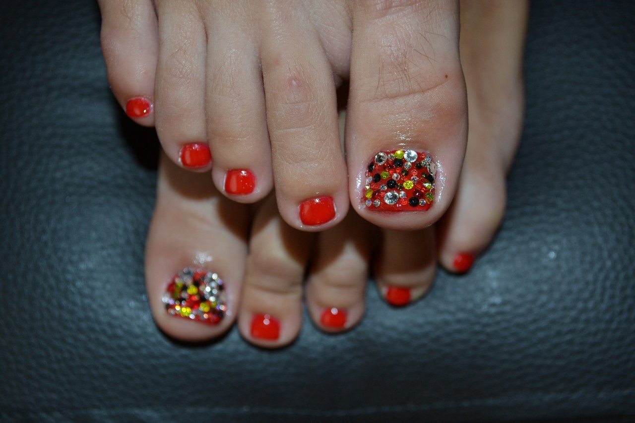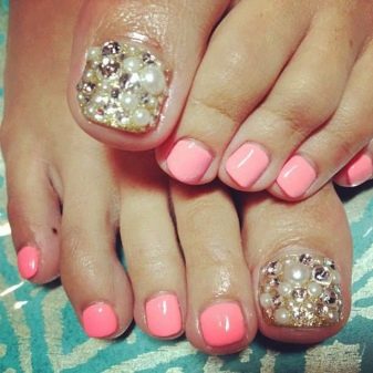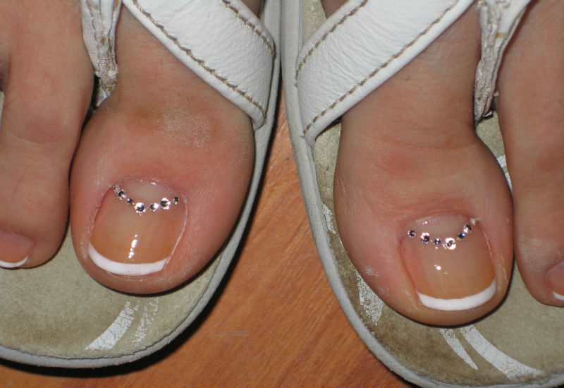 Beaucoup de gens créent une pédicure avec des strass de moyennes et très petites tailles. Pour ce faire, les ongles sont d'abord peints dans la couleur de votre choix, puis les premières grosses pierres sont appliquées sur la base.