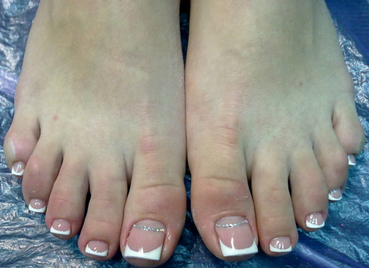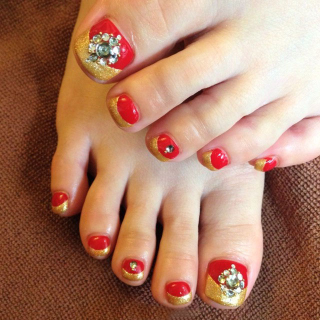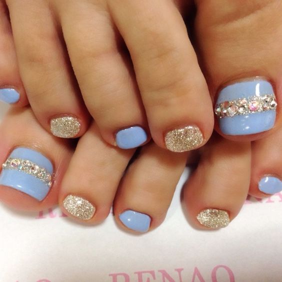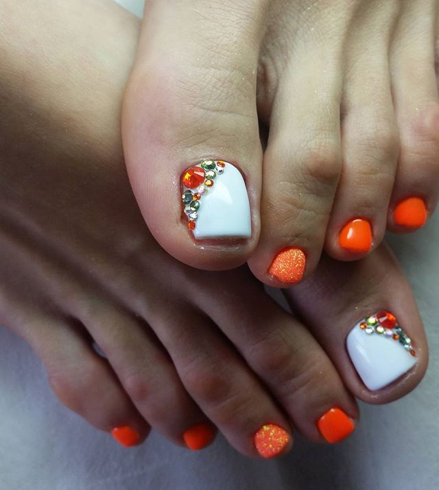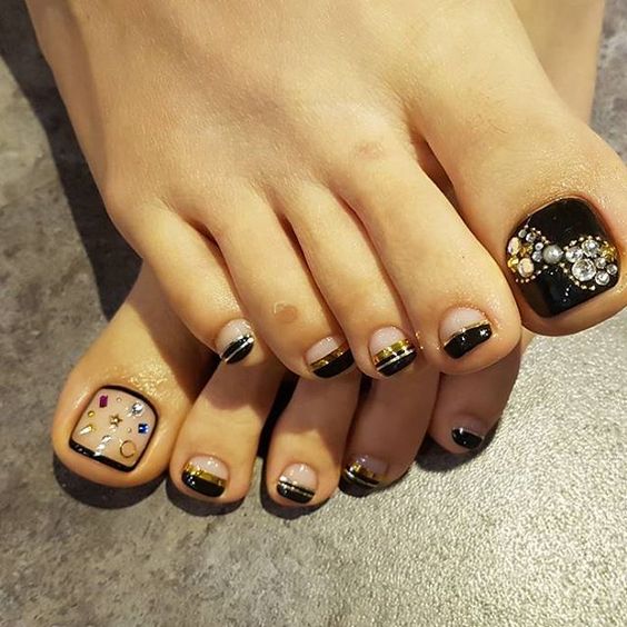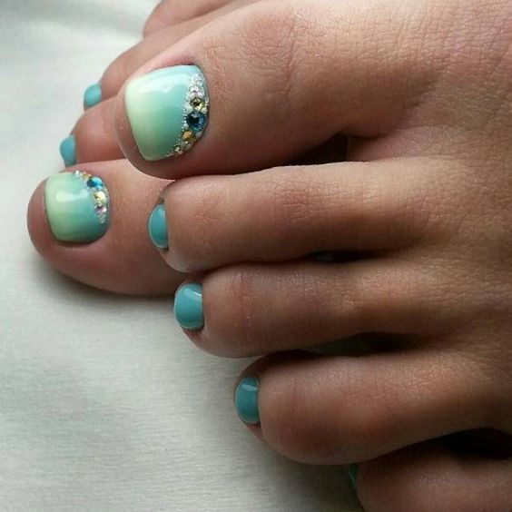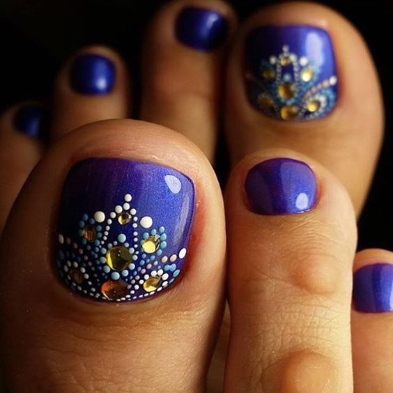 Beaucoup de gens créent une pédicure avec des strass de moyennes et très petites tailles. Pour ce faire, les ongles sont d'abord peints dans la couleur de votre choix, puis les premières grosses pierres sont appliquées sur la base.