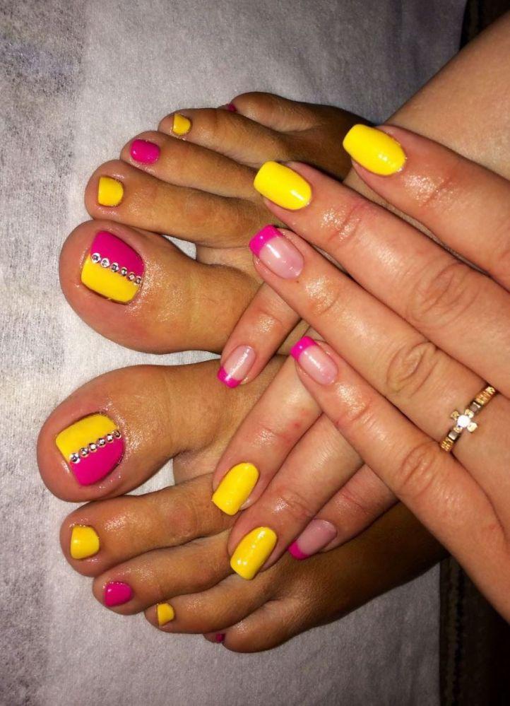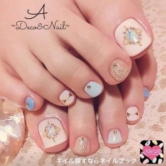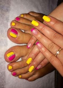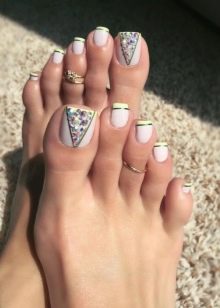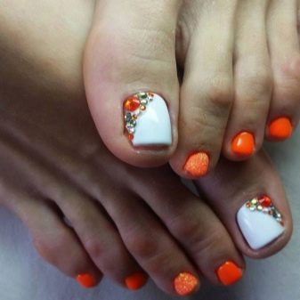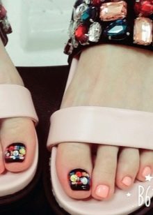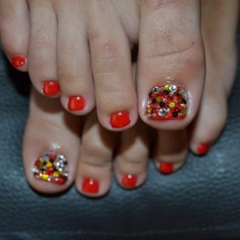 Certains designers se couvrent d’abord des ongles de couleurs vives et accrocheuses., puis y coller de façon chaotique des strass colorés. Ce type de pédicure original ne convient pas à toutes les filles. Lors de sa création, vous devez être prudent, car il s'avère souvent trop surchargé et contient des détails inutiles.