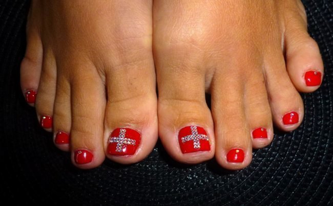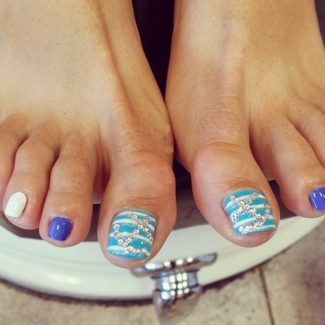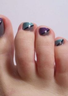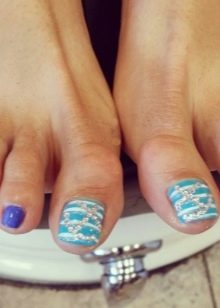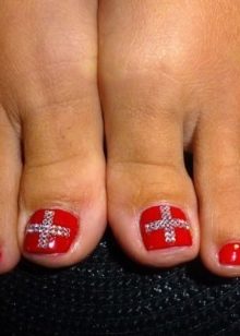Souvent, cette option est prise en laque blanche et rouge et en pierre bordeaux ou argentée. Ce type de pédicure, fabriqué dans les tons bleus ou utilisant le noir et le blanc ensemble, sera également harmonieux sur les ongles.