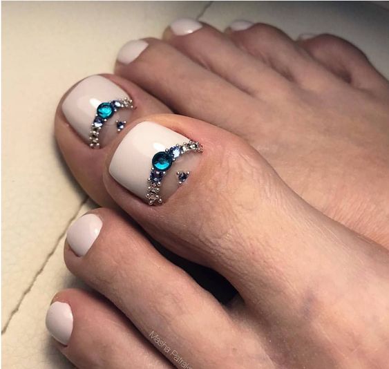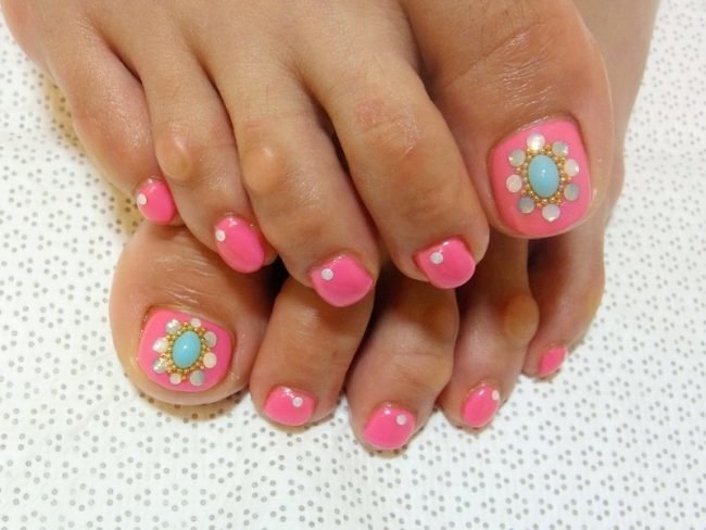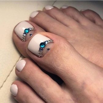 Pour rendre une pédicure plus intéressante, elle peut être complétée par de grosses pierres rondes et ombragées. Ils doivent être collés au milieu ou à la base du clou. Le vernis est préférable d'utiliser du blanc ou transparent, afin de ne pas surcharger la conception.