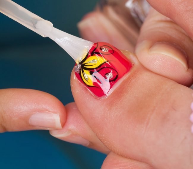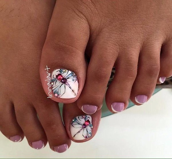 Pour pédicurer était original, sur le pouce on dessine souvent des images différentes. Souvent, pour cela, utilisez un pochoir en forme de petit papillon ou de libellule.