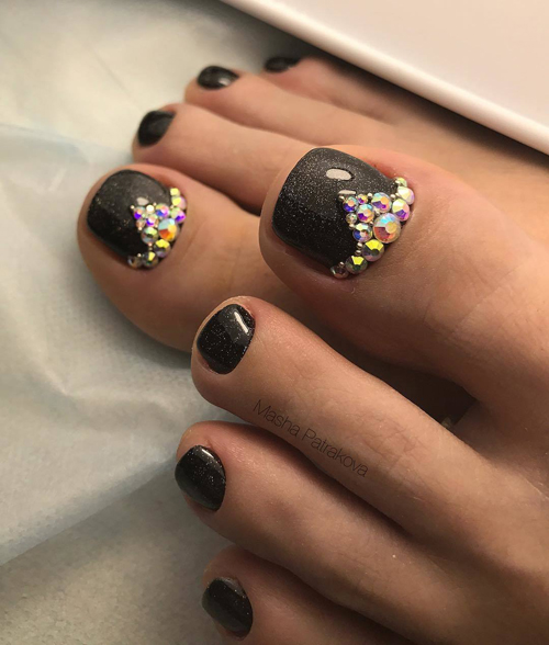 Aujourd'hui, il existe différentes pierres pour une telle procédure. Le plus souvent, les pédicures avec des strass font sur les gros orteils. Les pierres peuvent être en plastique, de tels éléments sont l'option de conception la plus courante.