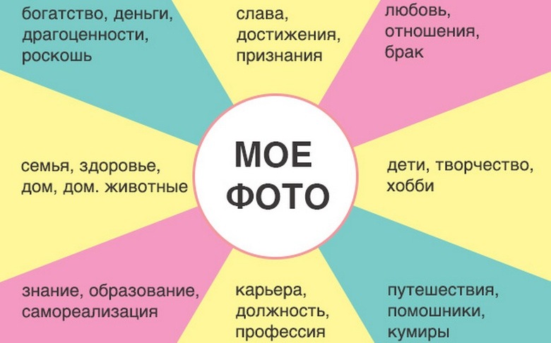 - Lower (central) square - this is your career. Write the hopes associated with your work or career advancement. For example, such: “I have reached (la) heights in my career, and they appreciate me at work” or “I am a valuable employee”. Photos of a big boss or manager will be an additional incentive.