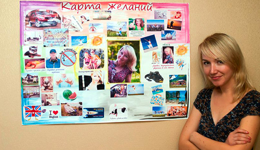 - Center top corner is part of self-realization. Here indicate your wishes related to the most secret aspirations. For example, you want fame or become a star. Be sure to post such inscriptions: “I became (a) a famous star” or “I became famous (for) the whole world with my talents”. Winged quotes reinforce photos of their idols. So you can quickly get closer to the goal.