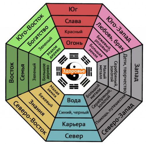 How are affirmations on the map? They are placed on the Bagua grid. This practice is a direction in the Feng Shui methodology and reproduces the conditional division of the area of life into areas of a certain impact. These areas are located in those places where all sides of the world are marked, according to this principle: