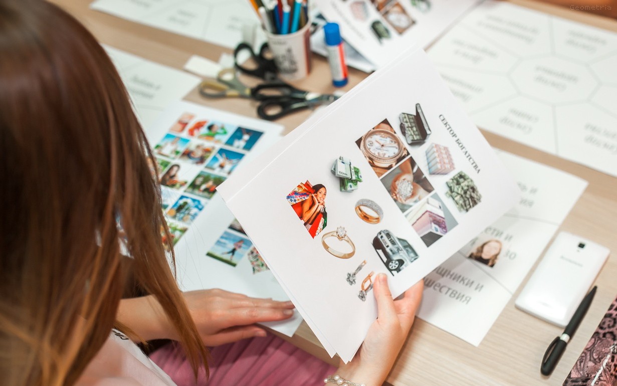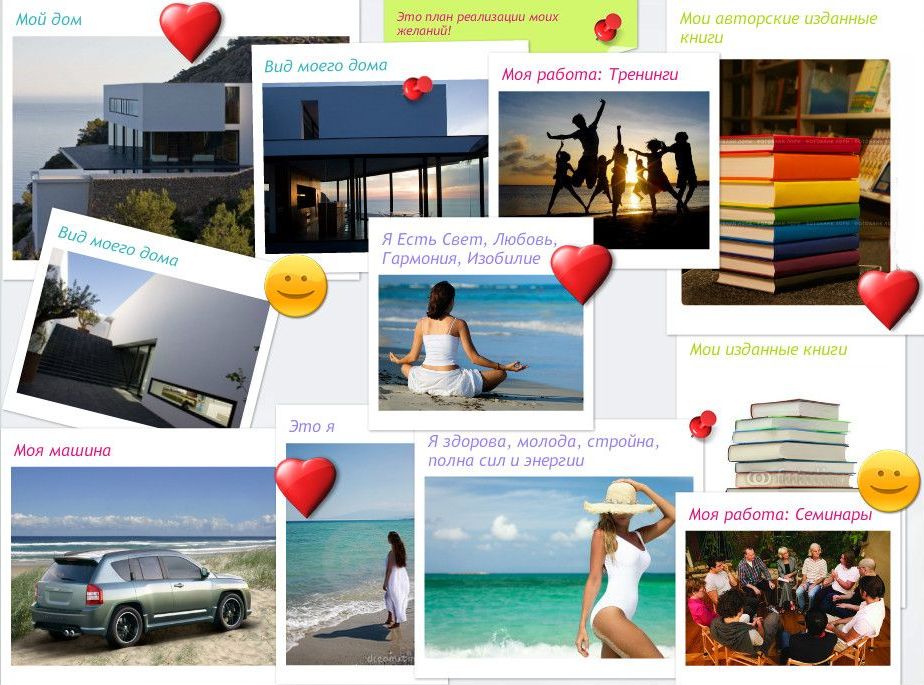 For the collage, select only bright and clear pictures that attract attention. Phrases must be written in clear and beautiful handwriting. Then they will become your real helpers.