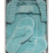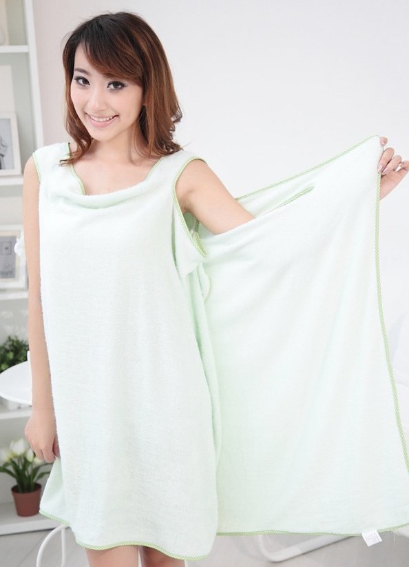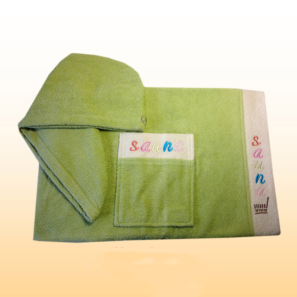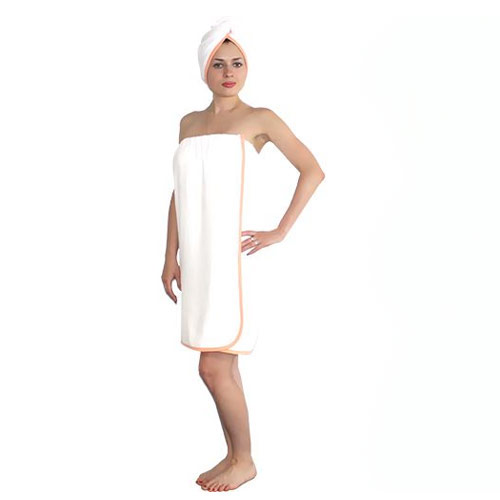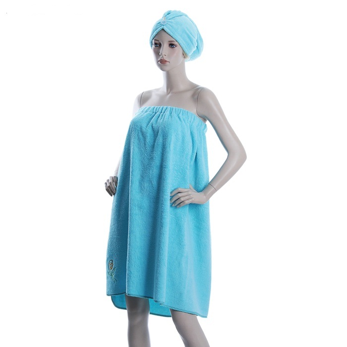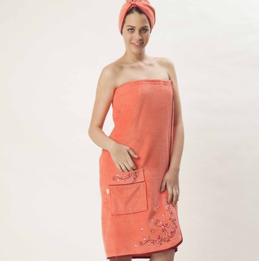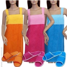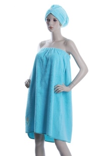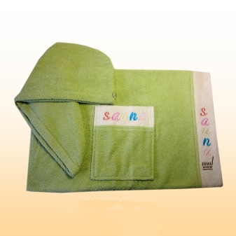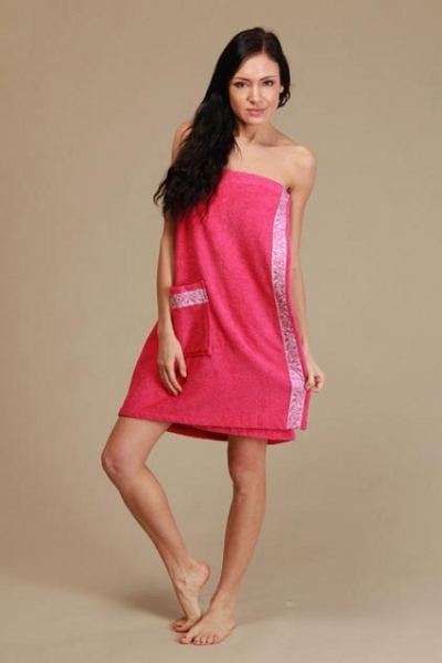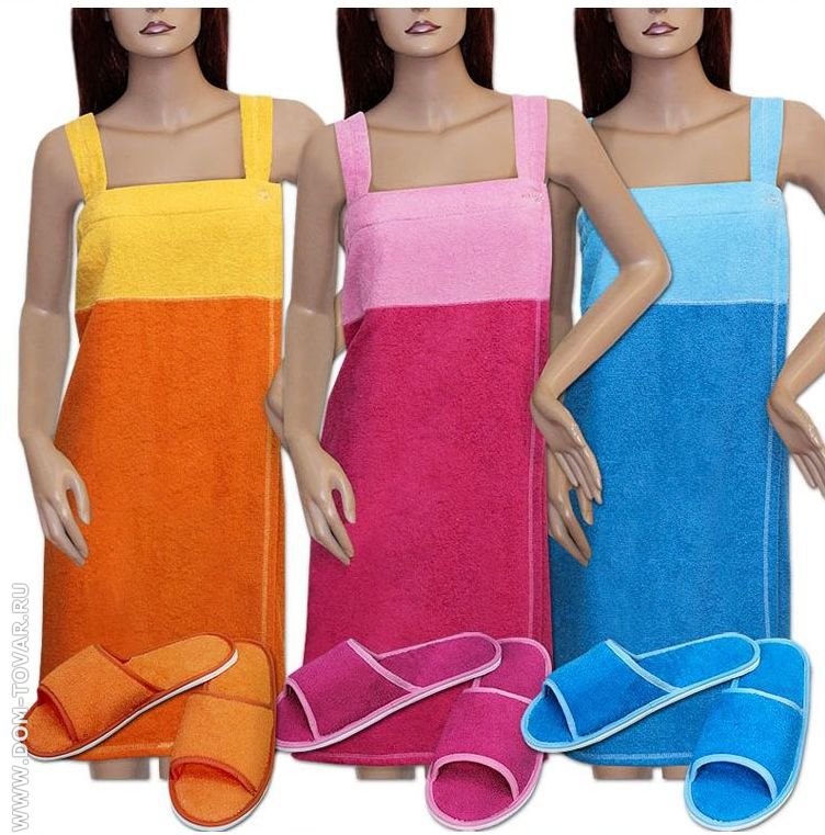 Bath dresses made of terry cloth can be decorated with embroidery and are most often made monochromatic, some styles are sewn with pockets. There are models with lace and bows or with ruffles at the top. A part of bath-dress towels is sold complete with turban, mitten or bath slippers. The choice of colors is very wide: pink, blue, red, green, yellow, olive and others, you can always choose according to your taste.