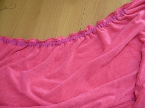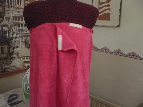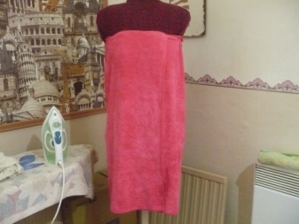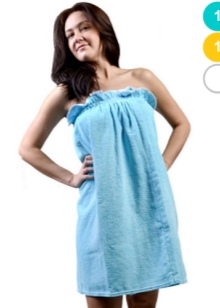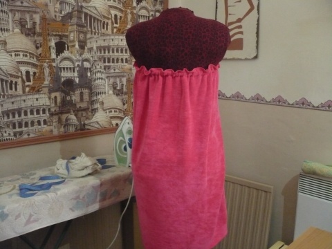 Some craftswomen make such bath dresses from ordinary towels. The ends of the velcro fastener are attached to the ends of the towel, taking into account the expected depth of the smell, and the middle of the cloth is scraped by an elastic band, which is sewn from the inside about an inch from the edge. The width of the elastic can be different, choose it according to the weight of the towel, the length is determined after fitting. During fitting, the gum should be slightly tensioned.