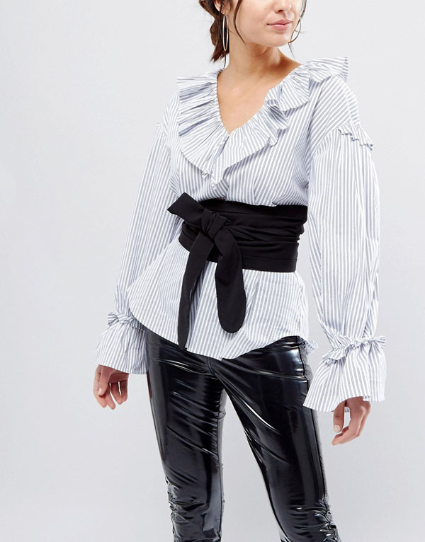 If you like to wear casual clothes, there is great news for you: wide belt looks harmoniously in such sets. Just pick up simple skinny jeans or black leggings, an elongated shirt, top or blouse and dilute this simple ensemble with a contrast strap with a small bow or without it.