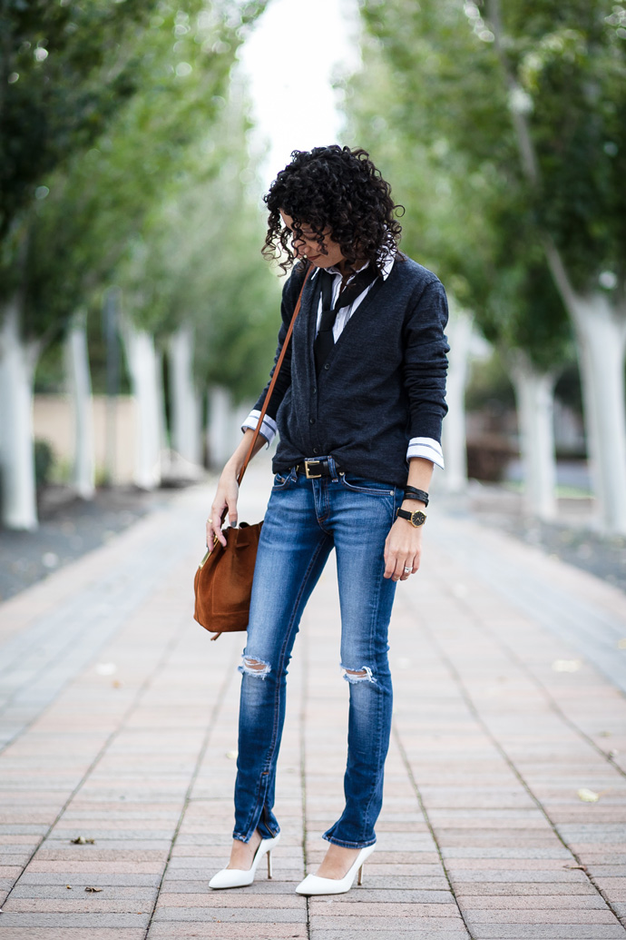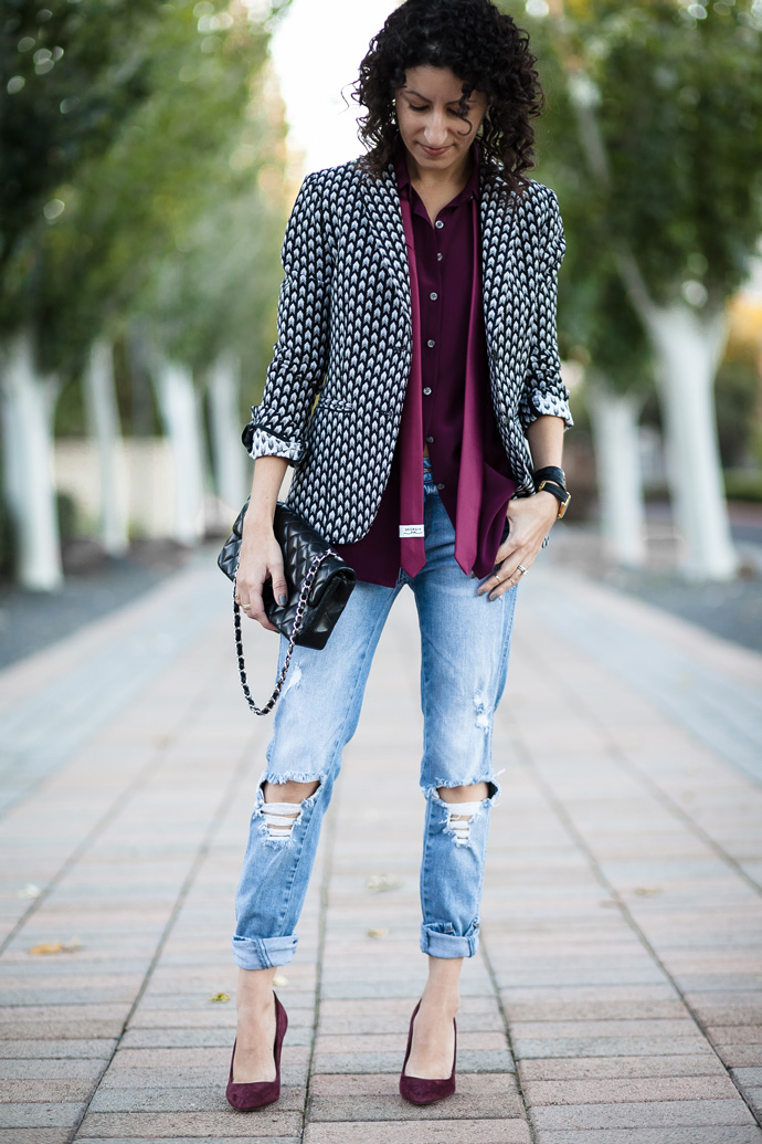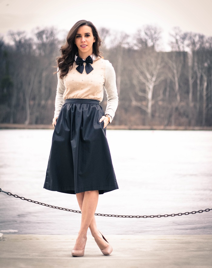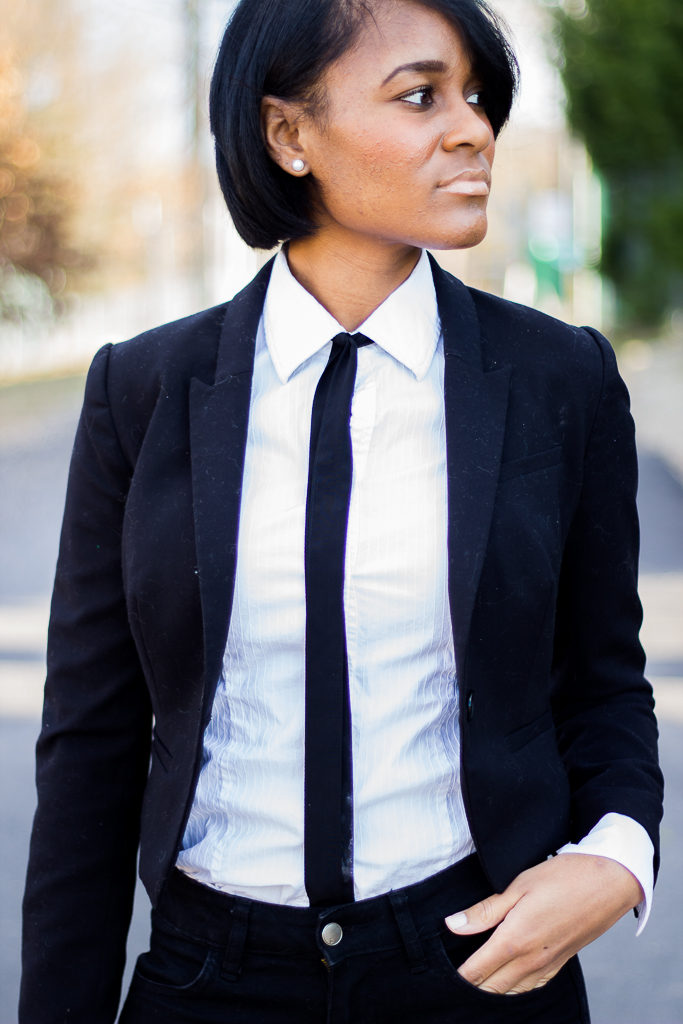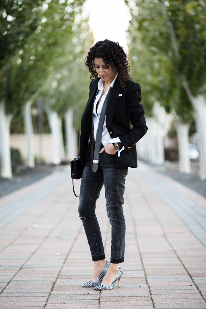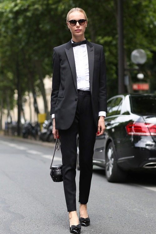This image from Annabelle Fleur is suitable for an informal meeting or a cocktail with friends. Also, those who have a free dress code at work can afford it. Leather skinny, black blazer, white dress shirt with tie and lace-up pumps. Look complemented by a roomy bag and stylish accessories.