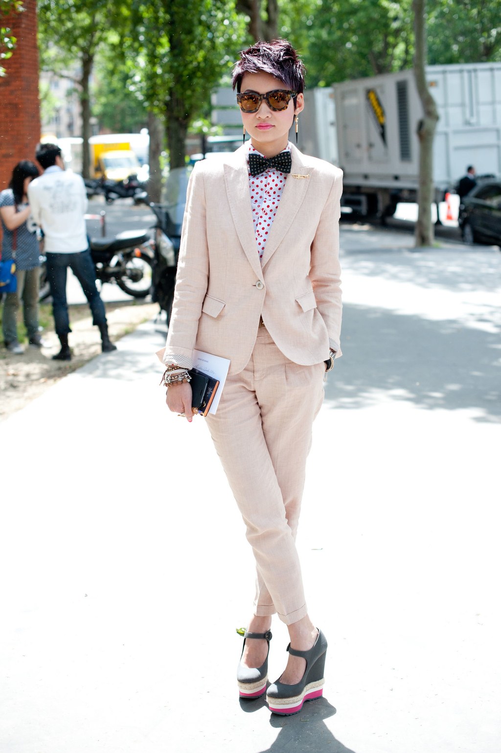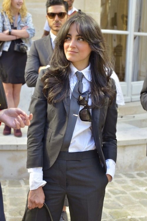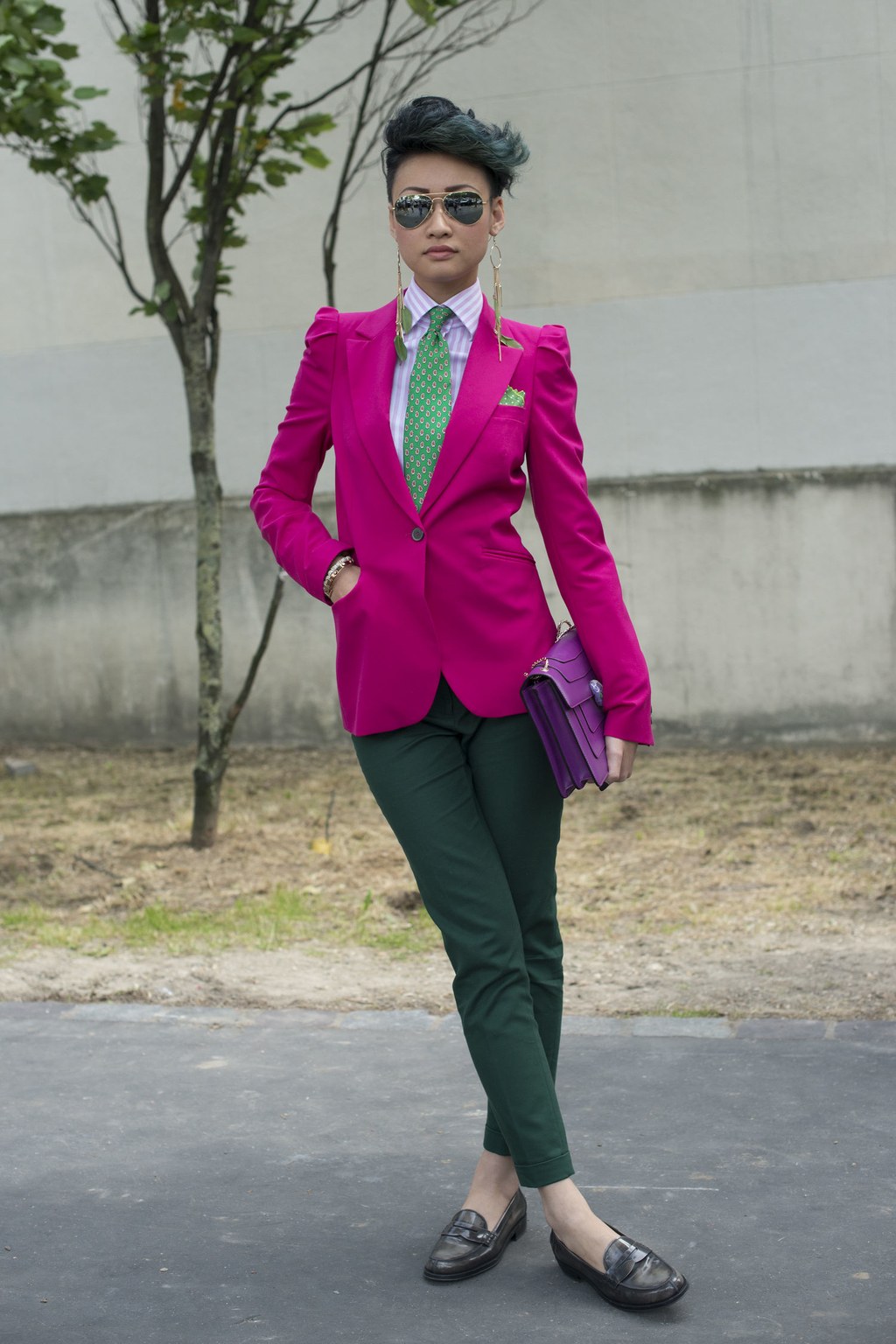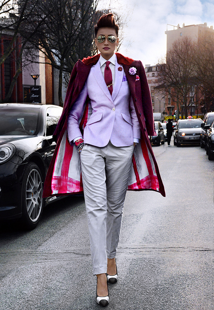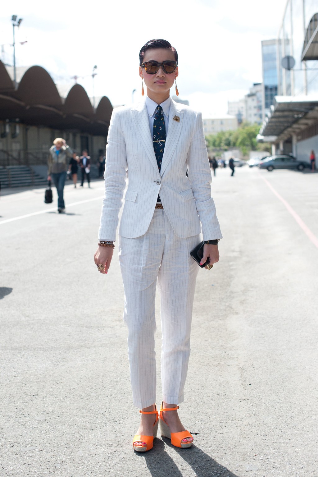 A white and blue striped dress shirt, dark gray tapered trousers, burgundy pumps and a tonal clutch. Look complements a wide navy tie, dark sunglasses, and large earrings-rings. Sylvia Navarro has turned out to be a 100% masculine business image!