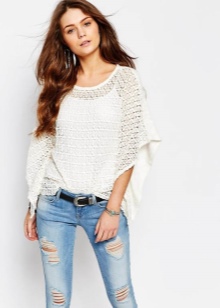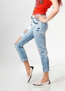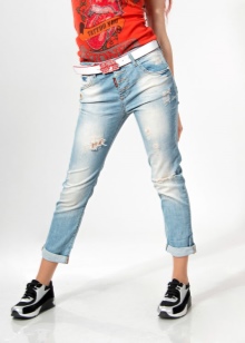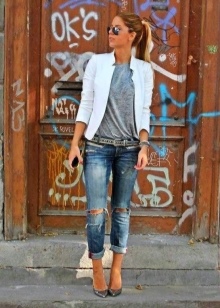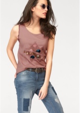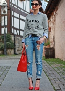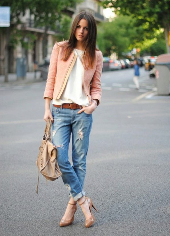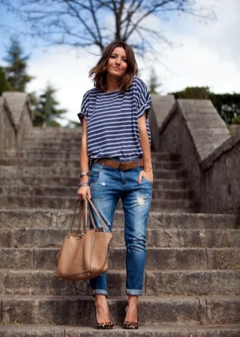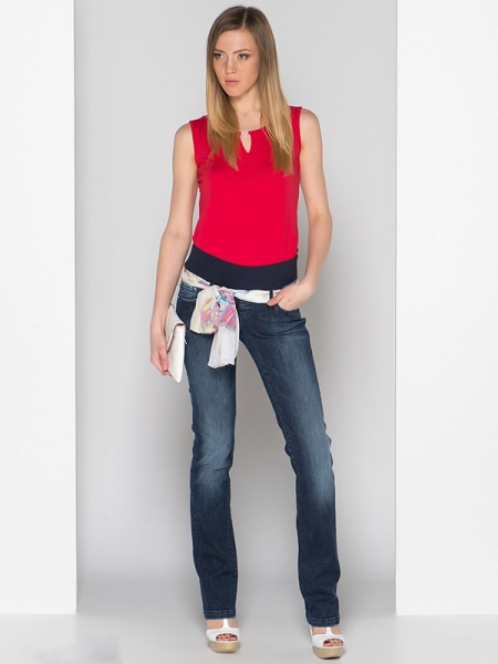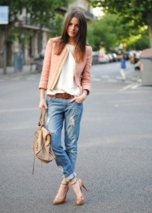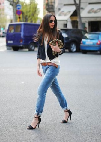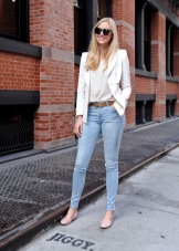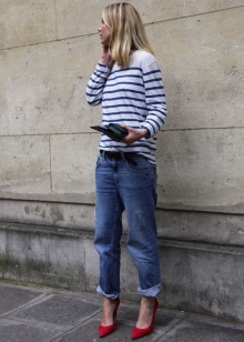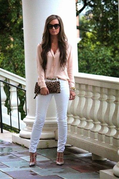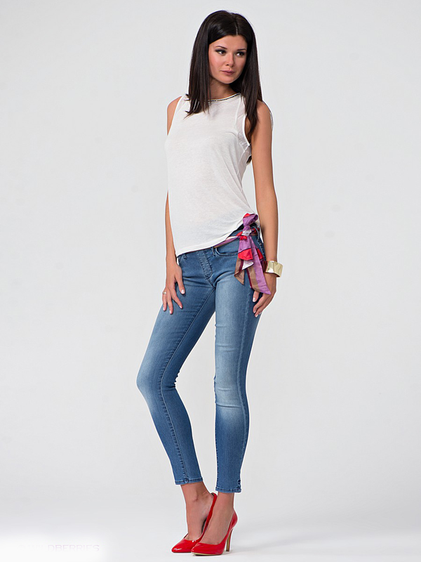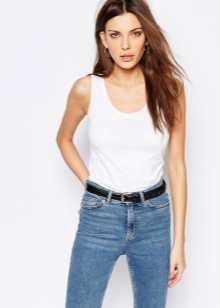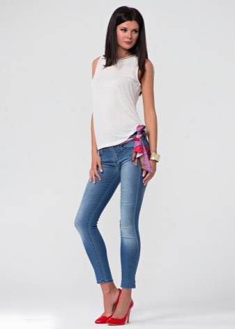 In summer, skinny jeans can be beautifully combined with a colored T-shirt or T-shirt. Pastel-pink belt and the same shoes with a very high heel form a bright and interesting ensemble. And wearing classic blue jeans and a white jersey, dilute your bow with rich detail. Multi-colored fabric belt and red shoes are great help in this matter.