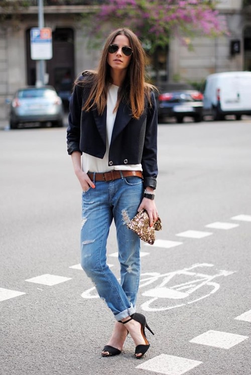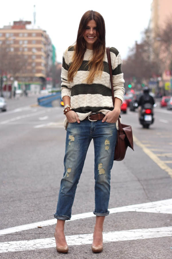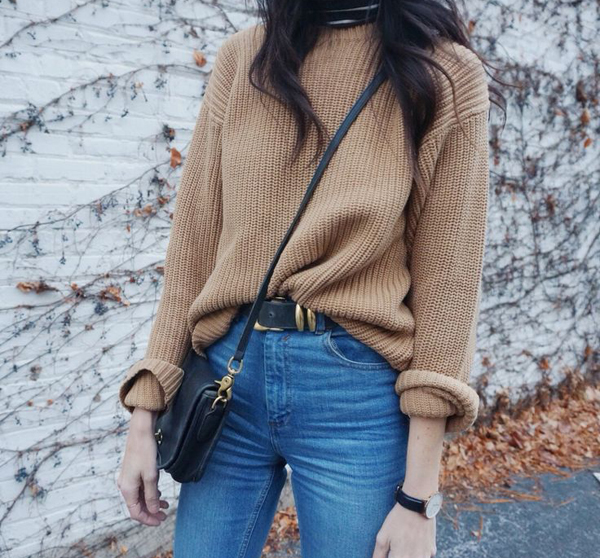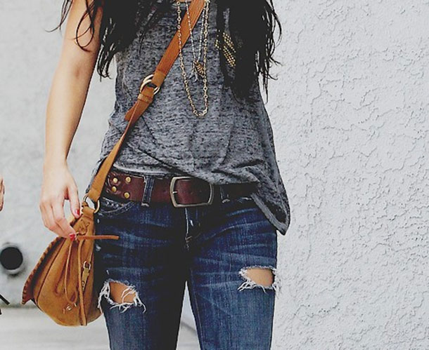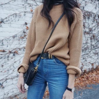 Under the usual blue jeans are well suited and brown belt. In the fall season, you will look just brilliant if you pick high leather or suede boots of the same color under your belt.