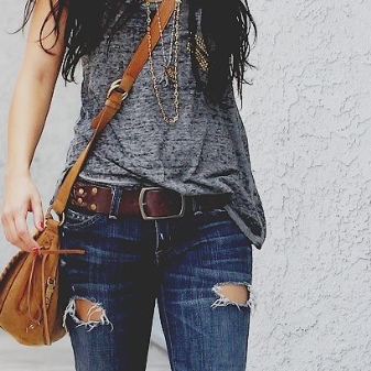 Different belt and width. Trouser belt, as a rule, narrow, it is intended to emphasize the elegance and consistency of the image. Denim models can be medium narrow or wide, it all depends on the taste of the girl. Many people choose precisely wide variants, they are better seen and they contain more decor. You can also hang handmade items on the wide strap - feathers, key rings, various talisman figurines.