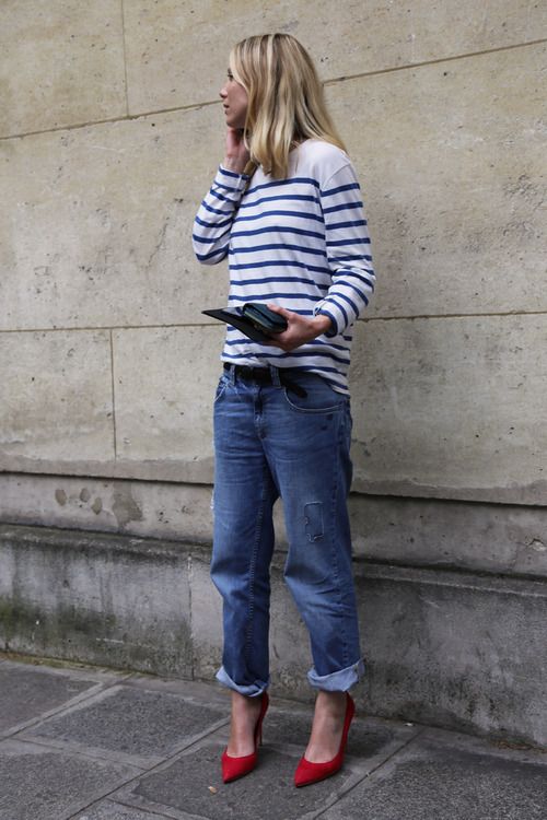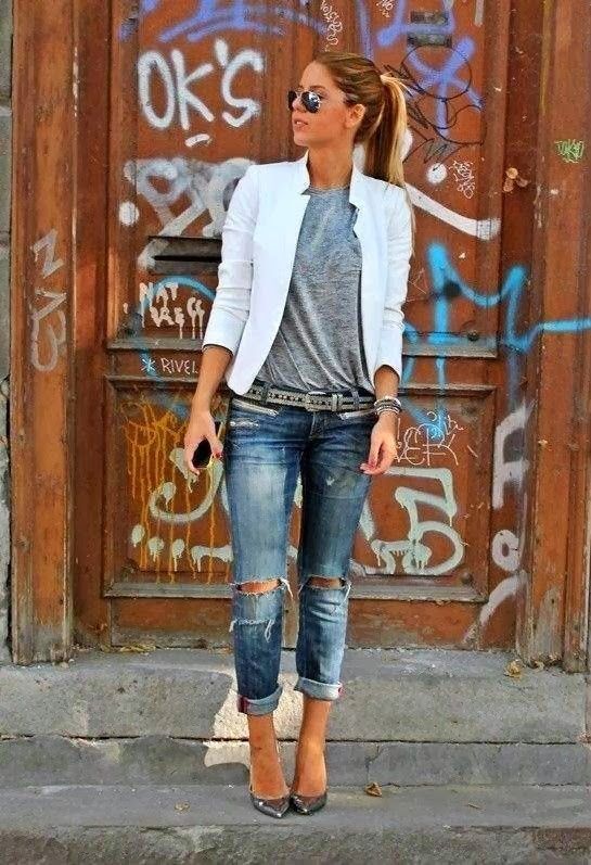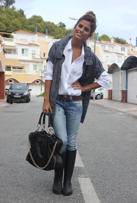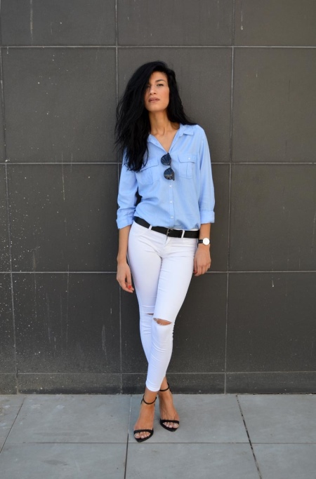 For a trendy look, a blue dress shirt tucked into skinny jeans is also suitable. From accessories, choose a narrow black belt and dark sandals.