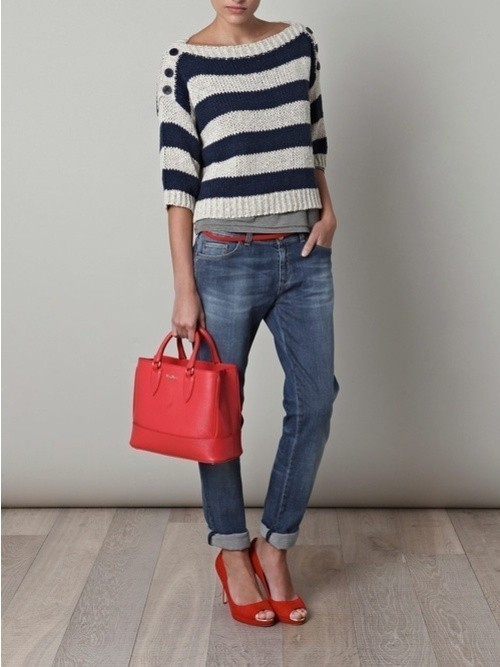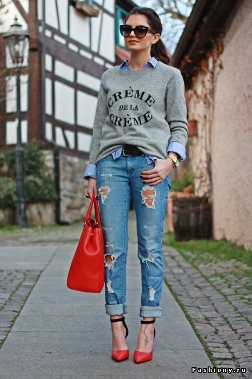 The red strap will help you to stand out from the crowd, it is very bright and saturated. Wear comfortable red shoes as a balance or take the same bag. The leopard print belt fits under blue and white jeans, and interesting glasses, a handbag or a light scarf will be a worthy finish to the image.