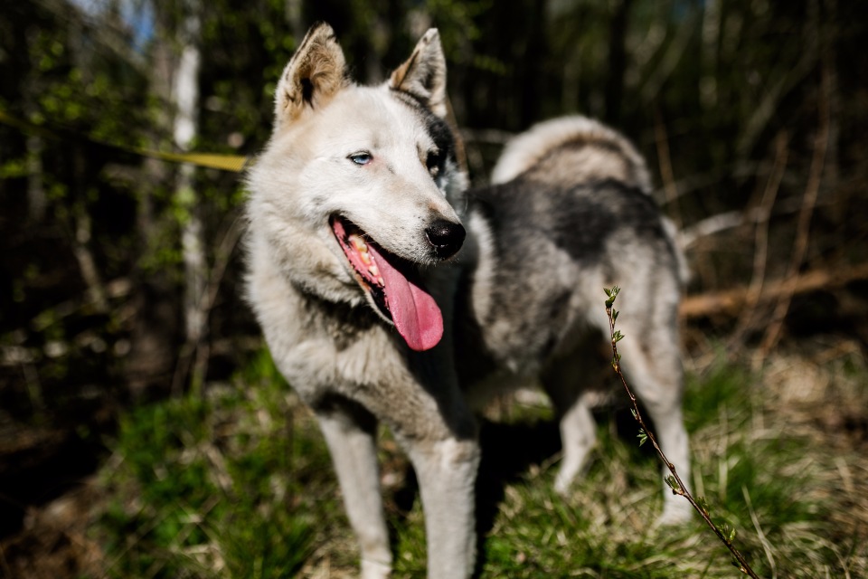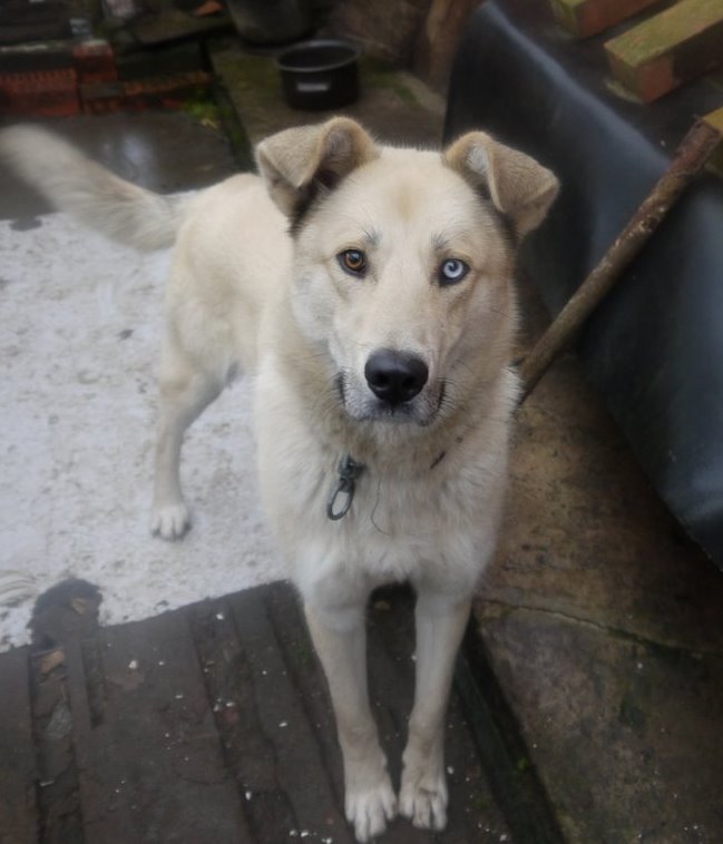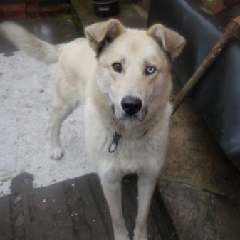 A cross with a husky inherits from alabya large physique. The color of wool, blue eyes, and triangular ears are a manifestation of the husky gene. The fur of this pet is dense.