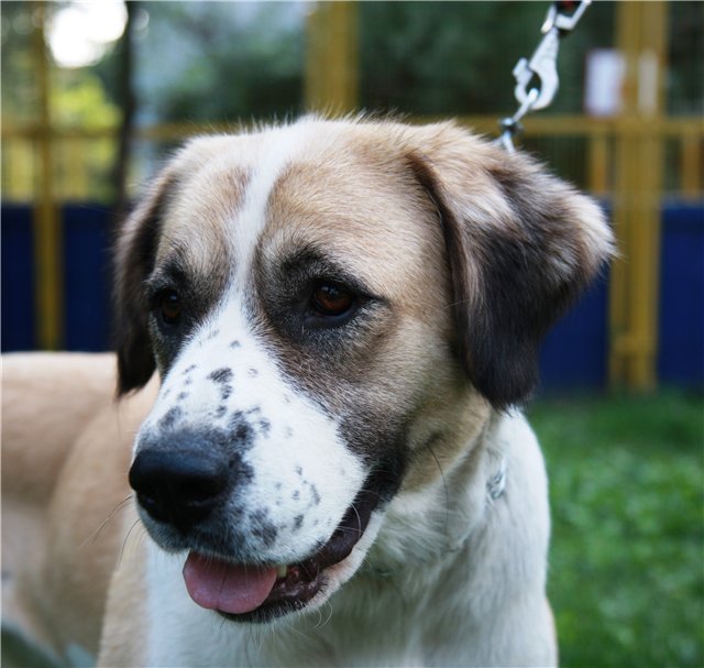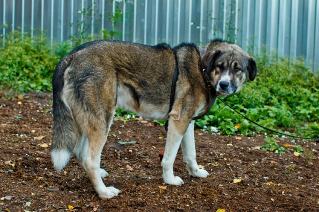 Crossed with the Central Asian Shepherd Tibetan Mastiff, it grows into a large individual. Powerful torso, large paws, thick hair, hanging ears are characteristic features of the cross. Color can be the most diverse: from black with white breast to red. It happens that the face, nose and forehead (in the middle) have a white color.