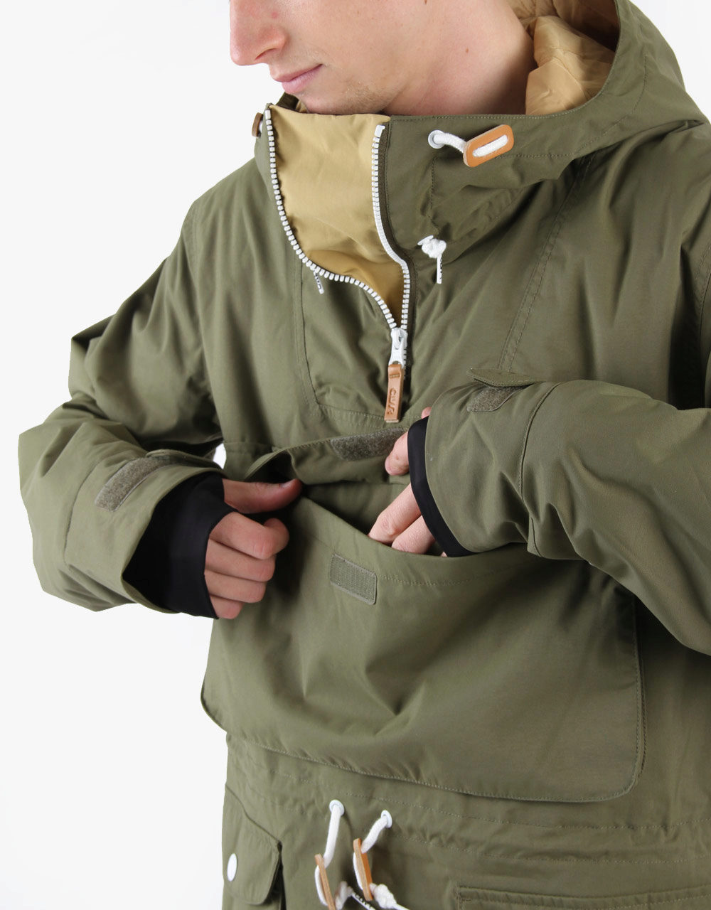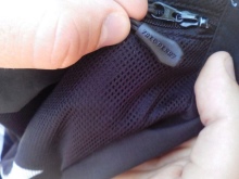 A breast pocket fastens with a zipper, contrasting with the color of the entire jacket and hidden under a horizontal bar. Sometimes a short chest zipper is replaced with snap fasteners.
